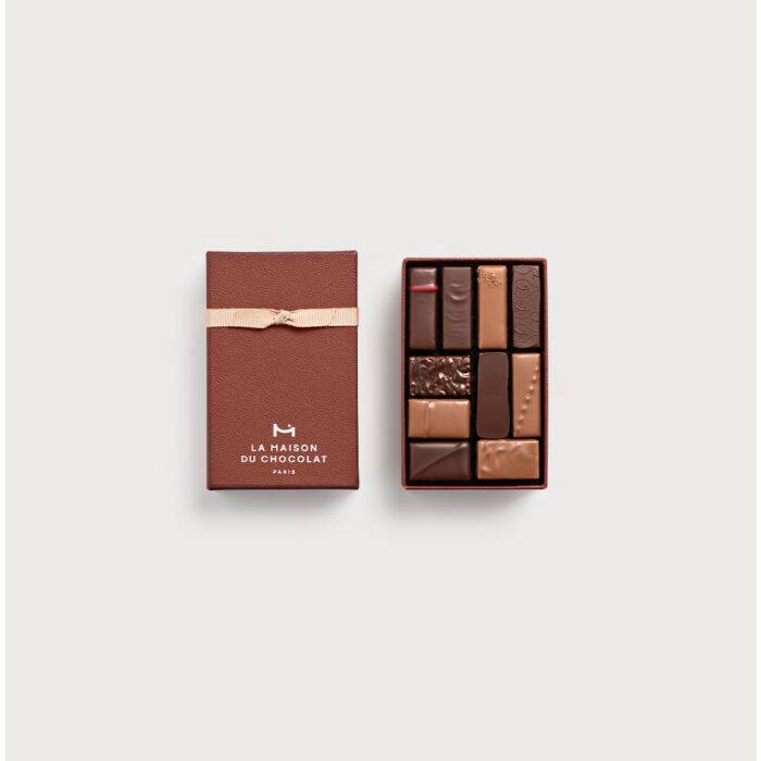 Slelection of ten dark and milk ganaches or pralinés, differents textures and balanced flavors. A delicate introduction to the chocolate universe for your customers. Customizable gift box: branded sleeve, label, or sticker.