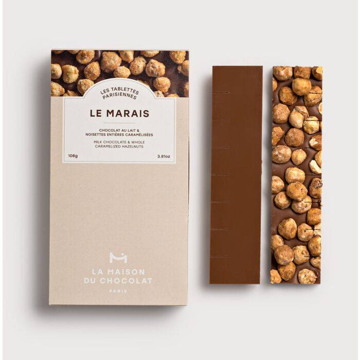The Le Marais Parisian chocolate bar represents the elegance of exceptional chocolate, conceived as a tribute to the Parisian art of living. This creation blends refined milk chocolate with whole roasted and caramelized hazelnuts, offering a tasting experience that is both generous and subtle. Each bite reveals a perfect balance between smoothness and crunch, in a recipe crafted by Nicolas Cloiseau, Meilleur Ouvrier de France and Chef Creator at La Maison du Chocolat. The bold presence of nuts meets the tenderness of cocoa in a graphic and indulgent format, ideal for corporate gifting. Presented in an elegant case, this bar becomes a statement of taste, where artisanal tradition meets modern chocolate artistry.