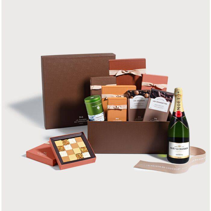 La Boîte Cadeau Paris propose une expérience de dégustation d’exception, pensée pour les amateurs de chocolat. Elle réunit une sélection généreuse de créations emblématiques de La Maison du Chocolat, enrichie d’un thé raffiné et d’un champagne d’exception pour sublimer l’ensemble. Ce coffret contient le Coffret Gourmandises (20 chocolats), le Coffret Truffes Cognac (245g), le Coffret Tablettes (16 chocolats), le Coffret Pralinés (16 chocolats), un étui d’Orangettes, un étui d’Amandas, le Coffret Maison Noir et Lait (84 chocolats), le Coffret Craquant (240g), une boîte de thé Palais des Thés et une bouteille de Champagne Bollinger. Chaque élément a été soigneusement choisi pour offrir une dégustation riche, festive et élégante. Parfait pour marquer une attention particulière, ce coffret prêt à offrir allie gourmandise, raffinement et générosité dans une composition qui fait plaisir autant qu’elle impressionne.