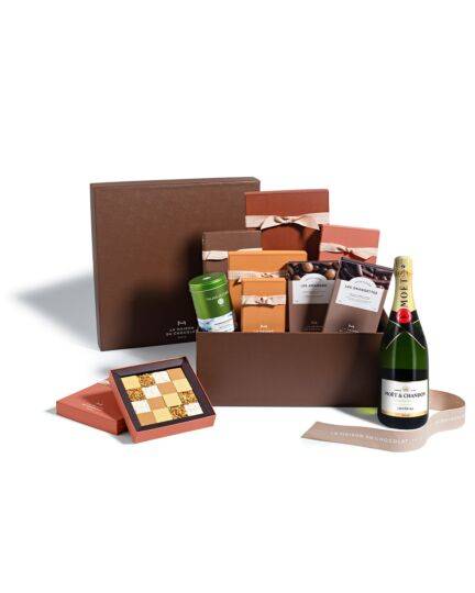 Boite Cadeau Paris - Cadeaux d’AffairesAssortiment prestigieux de 8 coffrets chocolatés, d'une bouteille de champagne et d'un thé parfumé.