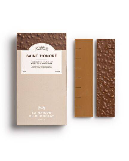 Tablette de Chocolat Saint-Honoré - Cadeaux d’AffairesChocolat au lait aux éclats de noix de pécan et chocolat blanc caramélisé.