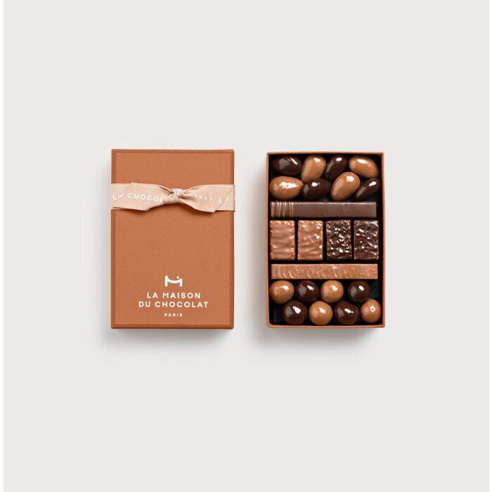 Le praliné Maison fait partie des goûts signature de Robert Linxe, fondateur de La Maison du Chocolat : d’abord un goût très prononcé de caramel cuit enrobant des notes de fruits secs intenses. Dans son mélange de fruits, de couverture et d’inclusion, il aimait pousser la cuisson du sucre à son paroxysme. Sa seule idée, désucrer au maximum pour ne conserver que la quintessence des fruits. Au début d’une aventure de 72 heures, de 3 étapes en 3 jours. Mélange de fruits secs et de chocolat mêlé d’inclusions, la « masse » du praliné est une texture entourée d’attentions. En plus de cristalliser très vite, elle est particulièrement sensible aux variations de températures. Maintenir son craquant sans l’assécher, l’enrober sans la faire fondre. C’est sur une variation délicate de température de 16 puis 21 degrés que tout se joue. A ce niveau de cuisson, c’est l’œil exercé du chocolatier qui détermine la cuisson parfaite. On parle du moment où la fumée devient « bleue » … Réalité ou légende ? Secret à déguster dans le Coffret de Pralinés.