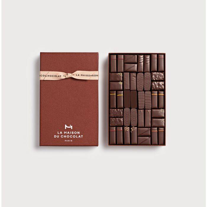 Pensé comme un cadeau d’affaires d’exception, ce coffret de 40 chocolats noirs incarne l’exigence et le savoir-faire artisanal de La Maison du Chocolat. Chaque bouchée révèle une palette aromatique riche et nuancée : ganaches aux infusions épicées ou fruitées, pralinés noirs aux fruits secs caramélisés, et une pâte d’amande à la pistache. L’enrobage fin et fondant des chocolats témoigne de la qualité des fèves sélectionnées par Nicolas Cloiseau, Meilleur Ouvrier de France. Présenté dans un écrin sobre et sophistiqué, ce coffret personnalisable (fourreau, étiquette ou chocolats siglés) devient un présent marquant, idéal pour vos clients fidèles, vos partenaires ou vos collaborateurs.