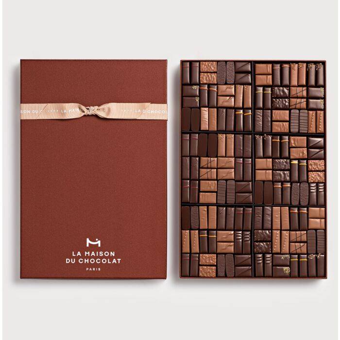 Avec ses 144 chocolats noir et lait, ce coffret illustre la maîtrise artisanale de La Maison du Chocolat. Il réunit une palette généreuse de ganaches aux arômes subtils de cacaos intenses, notes fruitées ou épicées et de pralinés aux textures contrastées, mêlant éclats caramélisés, crêpes dentelle et fruits secs concassés. Chaque chocolat est pensé pour offrir une expérience sensorielle, entre fondant et croquant. Élaborées avec exigence, ces créations sont façonnées à la main pour garantir une qualité d’exception. L’écrin, au design sobre et élégant, s’adapte à vos besoins grâce à ses options de personnalisation : fourreau ou étiquette ou chocolats siglés. Ce coffret devient ainsi un cadeau d’affaires sur mesure.
